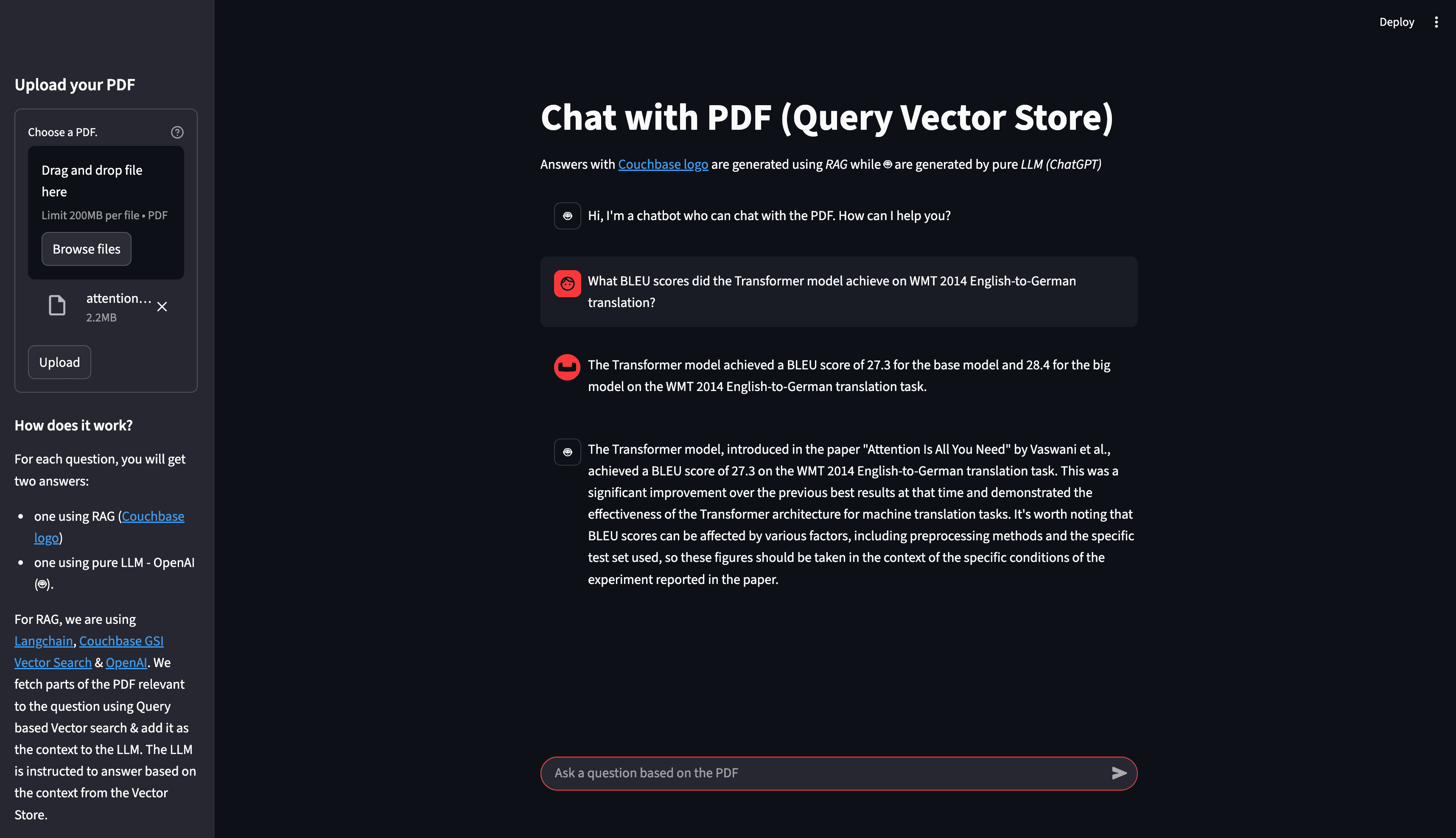 In the main area, there's a chat screen where you can ask questions about the uploaded PDF document. You will receive two responses: one with context from the PDF (Couchbase Logo - ) , and one without the PDF context (Bot Logo - 🤖). This demonstrates how the Retrieval Augmented Generation (RAG) model enhances the answers provided by the language model using the PDF content.